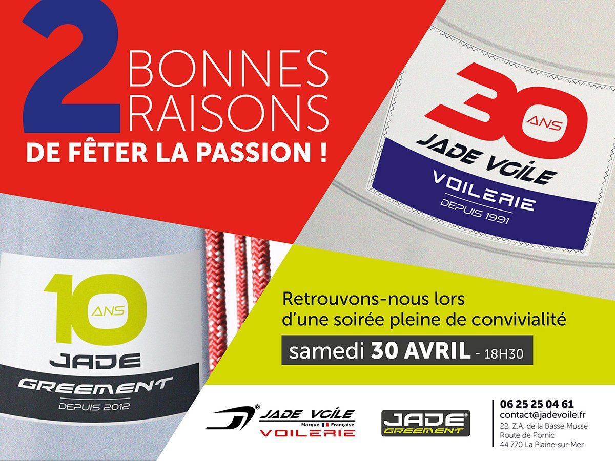 Depuis 10 ans, JADE GREEMENT est à votre service. Nous assurons les prestations de gréement matelotage, accastillage de pont pour tous types de voiliers. Venez fêter cet anniversaire le Samedi 30 Avril 2022 a 18h30 22 ZA de la Basse MUSSE / 44770 LA PLAINE sur MER Merci de nous confirmer votre présence à contact@jadegreement.fr Au plaisir de partager ce moment de convivialité.